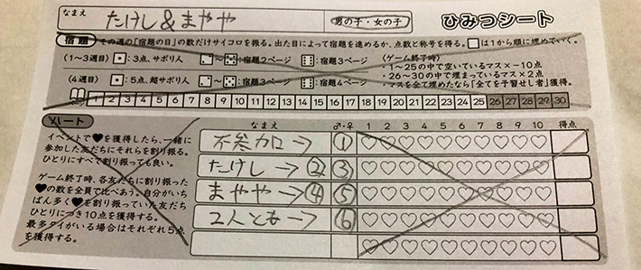 - 「ハート」の「なまえ」の欄に上から順に「不参加→①」「たけし→②③」「まやや→④⑤」「2人→⑥」と書きます。