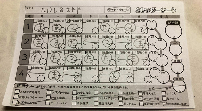 「言い出しっぺ」は彼らのカレンダーシートの該当する日にちに印をつけて、予定が埋まった事を表してください。(シート見本の画像を参考にして、転校生の名前の頭文字や、2人とも参加なら「2」と書いたりするとよいでしょう)